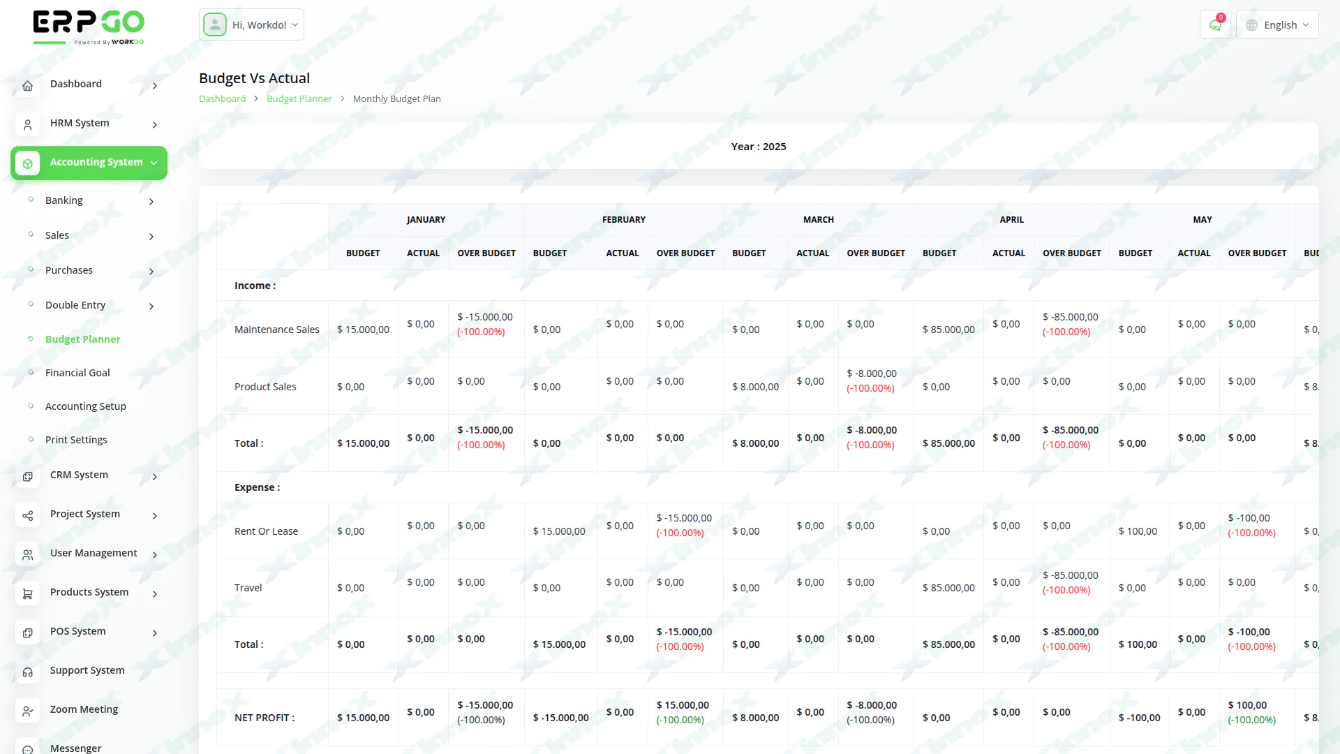 A budget is a financial plan for a specified period to keep in check with the working capital. This feature here helps to maintain the capital flow. You can set monthly, quarterly, half-yearly, or yearly budgets according to your business plans and needs. The main categories are “Income” and “Expense” where one can edit /update /delete the sub-categories as well.