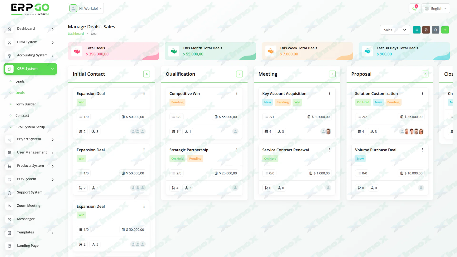 Just like lead management, you can view deals in Kanban or List view. Get an overview of deals in a week, month, and deals in the last 30 days. Assign Tasks, Products, Files, and Users for each deal. Manage discussions and notes.