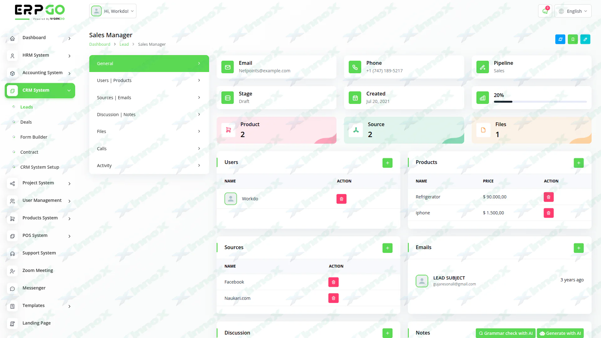 You can view all the generated leads through a Kanban and List view. Create pipelines and assign stages to various leads. You can manage the leads by adding Users, Items, Files, Notes, Sources, Call Details, Emails, and Discussions. Get all the requisite information on any particular lead in an easily laid layout.
