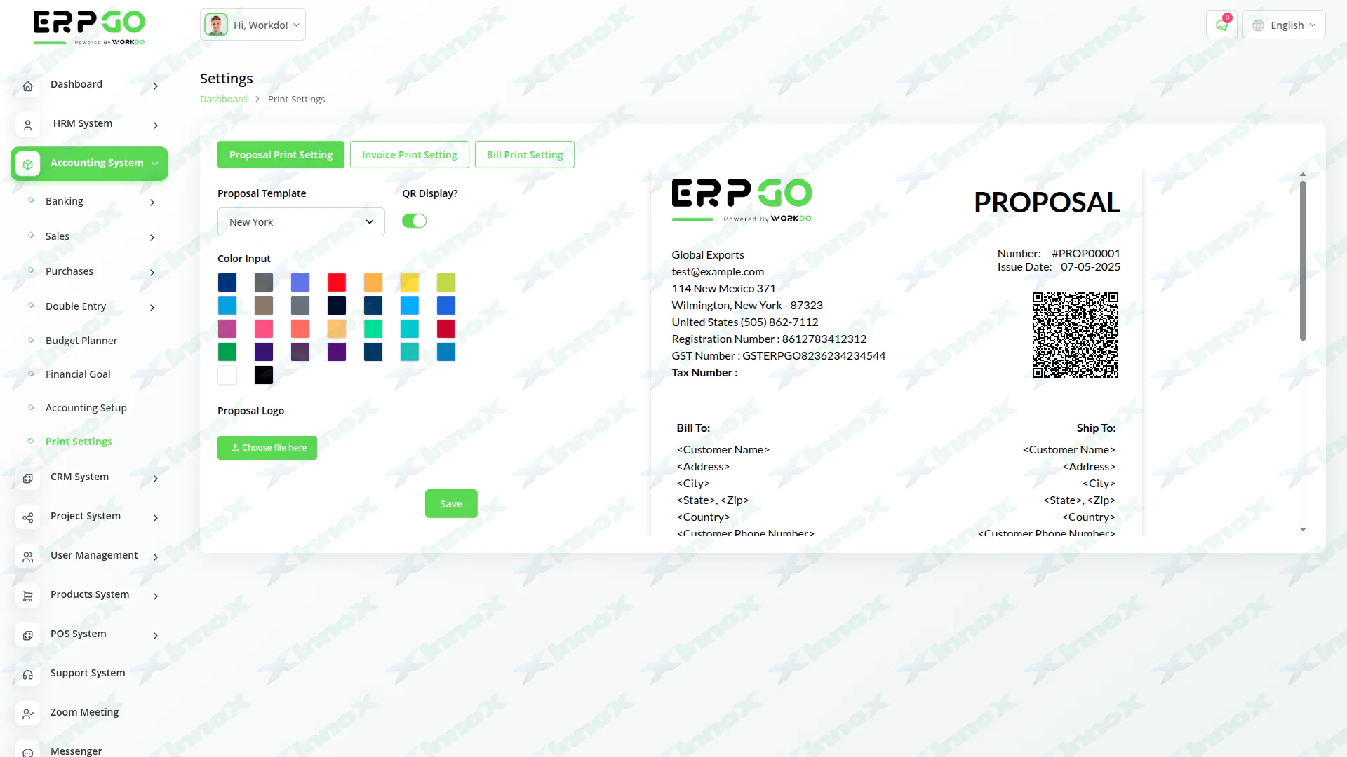 Manage business and company settings. Customize your system settings and print settings for Invoices and estimates. Also, manage the pusher settings.