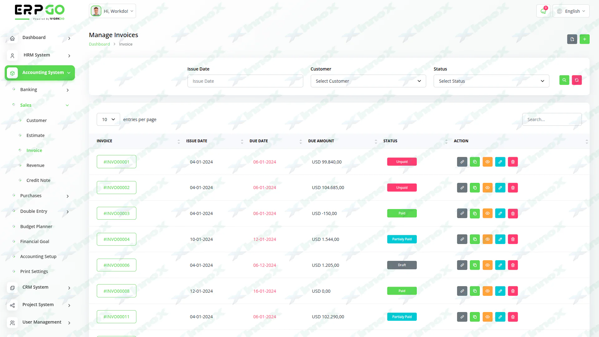 ProERP SaaS has the most comprehensive dashboard with all the essential details under one head. We all can agree that dashboards have made our lives easier. Well, from every minute detail like total Clients, Users, Invoices, Projects, and estimations to Leads, Deals, and items, you can get quantitative data in the most simple layout. You get an overview of Estimates, Invoices, top-due Payments, Projects, and Tasks to take timely actions. Get a reminder of meeting Schedules, Expiring Contracts, Weekly Events, and new clients as you scroll down. Lastly, a Pie Chart can help you understand various project statuses. In short, every activity of your business can be handled through this useful tool.